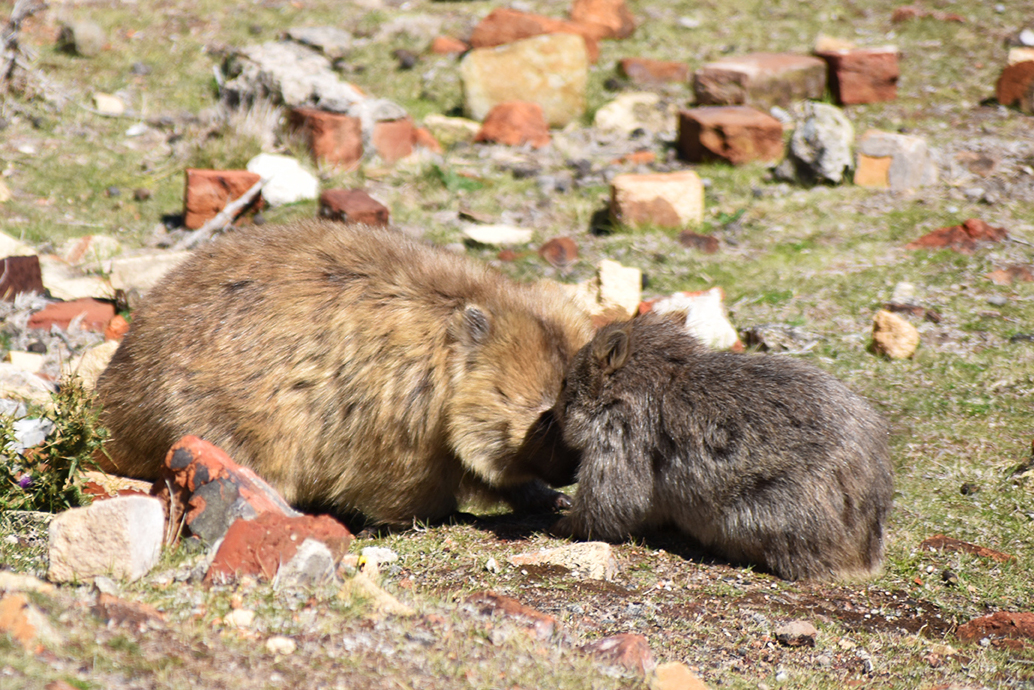 ウォンバットの親子。ぴょんぴょんしながらじゃれ合っていました。観光客がゆっくり静かに集まっていく様子も面白かったです。笑
