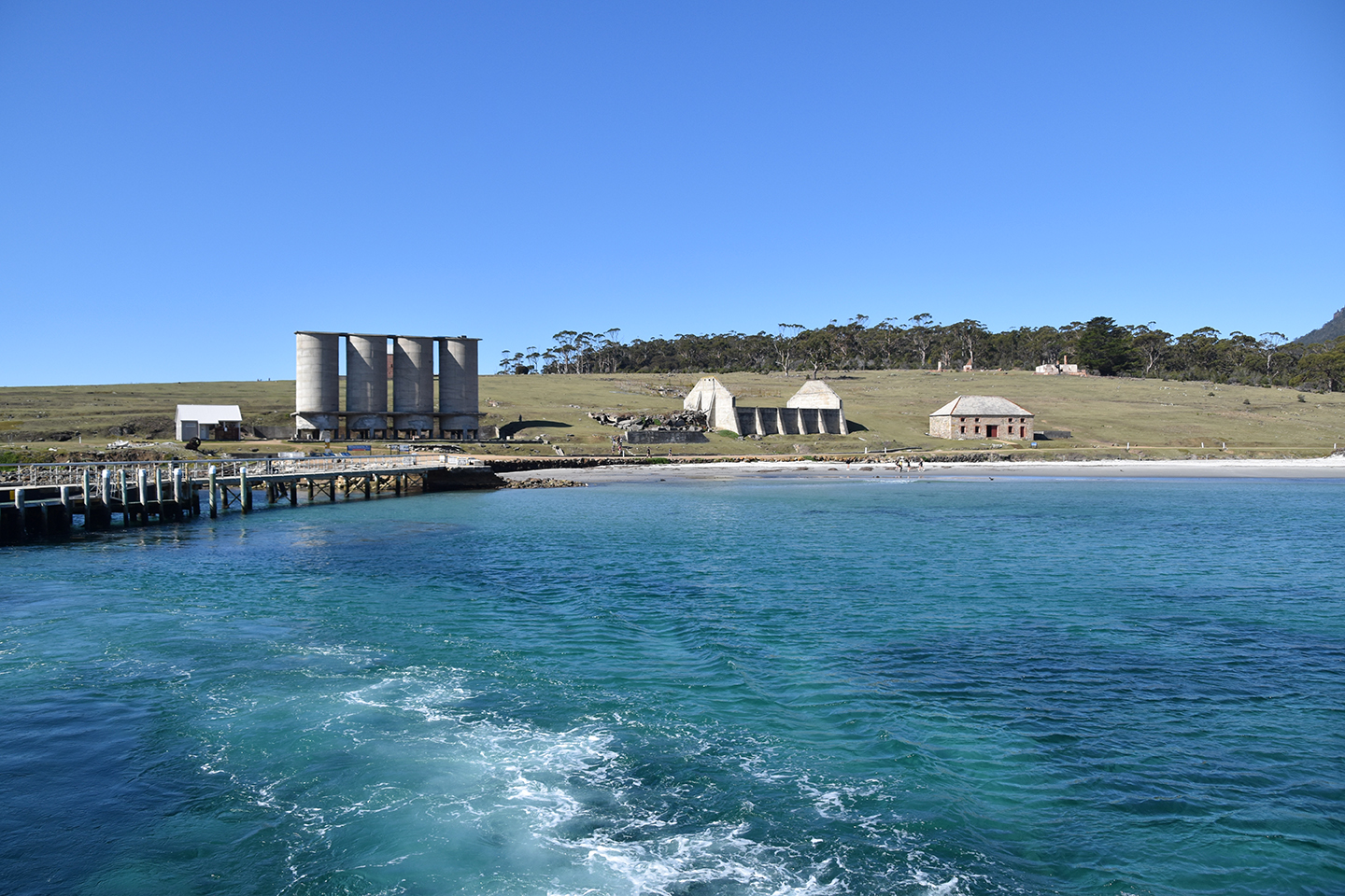 マリア島に上陸!青い海がとても綺麗です。流刑地として利用されていた跡地が随所に見受けられます。