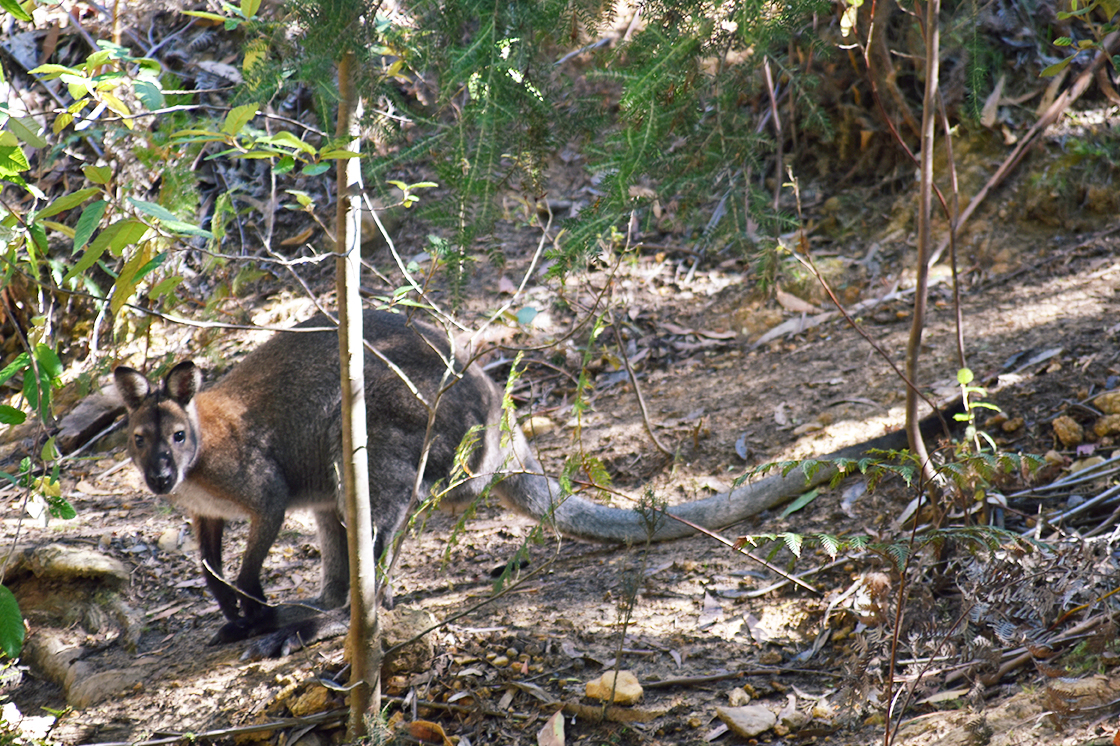 カンガルーにも会えます。ただウォンバットとは違い彼らは警戒心が強いです。この子は近くで会えたけど遠目で「あそこにいるよ」と言われて気づくのがほとんどでした。