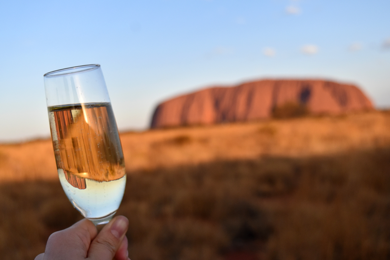 3-4箇所を巡って夕方、ついに1番の名所エアーズロック鑑賞へ!ツアーに含まれてたワインを片手に壮大な一枚岩を鑑賞。ちなみに私は勝手に「ここからどんどん赤くなる」と思っていましたが到着時がピークの赤さでした笑。
